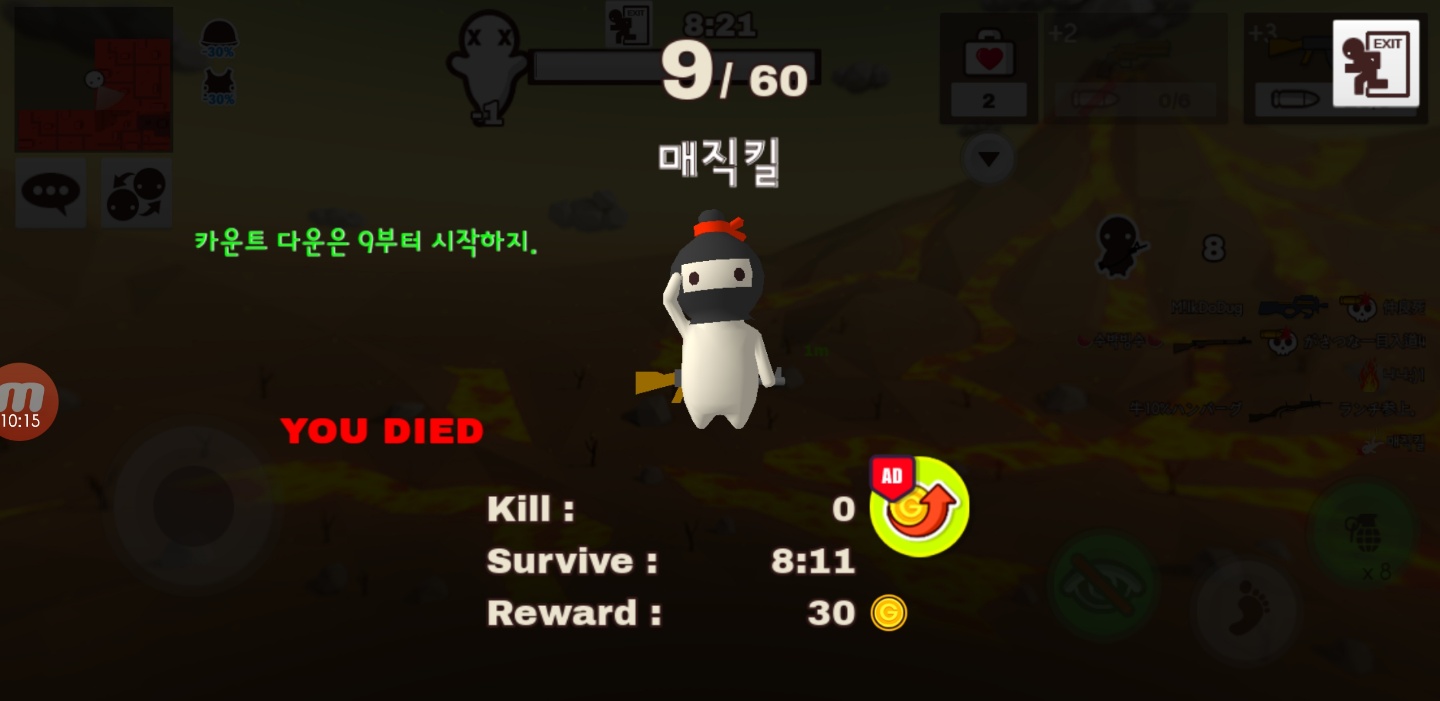 이럴수가!9위라니!평소엔 40위 정도 하는데!자리를 잘 잡았네요!빨리 불 타지 않는 곳으로 갓 그런가봐요!다음에도 이 자리로 와야지~어쨌든 가장 어이없는 방법으로 죽었습니다.바로 낙사...불 타는게 예고 되서 황급히 도망치려다가 이렇게 됬네여 ㅠㅠ